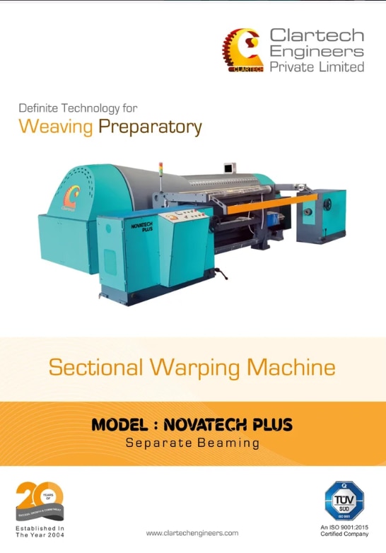 Novatech Plus Sectional Warping Machine Manufacturer Clartech Engineers Private Limited is a leading Novatech Plus Sectional Warping Machine Manufacturer, offering a highly efficient and advanced warping solution designed for precision and durability. Product Specifications: Automation Grade: Automatic Working Width: 2200mm to 4200mm Beaming Speed: 200 MPM Drum Diameter: 1000 mm Traverse Motor: 2 KW Warping Speed: 700 MPM Waxing Device: With VFD Beaming: Separate Unit Beaming Tension: Auto Controlled Country of Origin: Made in India Minimum Order Quantity: 1 Piece Product Description: The Novatech Plus Sectional Warping Machine Manufacturer introduces this state-of-the-art model featuring dual servo technology for superior control and accuracy. Built with an ergonomic and robust design, the machine includes a separate beaming unit for optimal workflow. AC Servo systems power both the linear and undercarriage traverse, enabling accurate warp lengths and exact sectional formations. The intuitive 15” high-resolution soft-touch display supports lost-end memory and smart features for efficient operation. It allows data transfer for printing and interfacing with external systems. With a dynamically balanced 1000 mm diameter drum and fixed cone height, the machine delivers high-speed stability and performance. Integrated safety sensors on the beaming side ensure operator safety and smooth functioning. Choose Clartech Engineers Private Limited – a trusted Novatech Plus Sectional Warping Machine Manufacturer – for advanced, reliable, and efficient warping solutions.