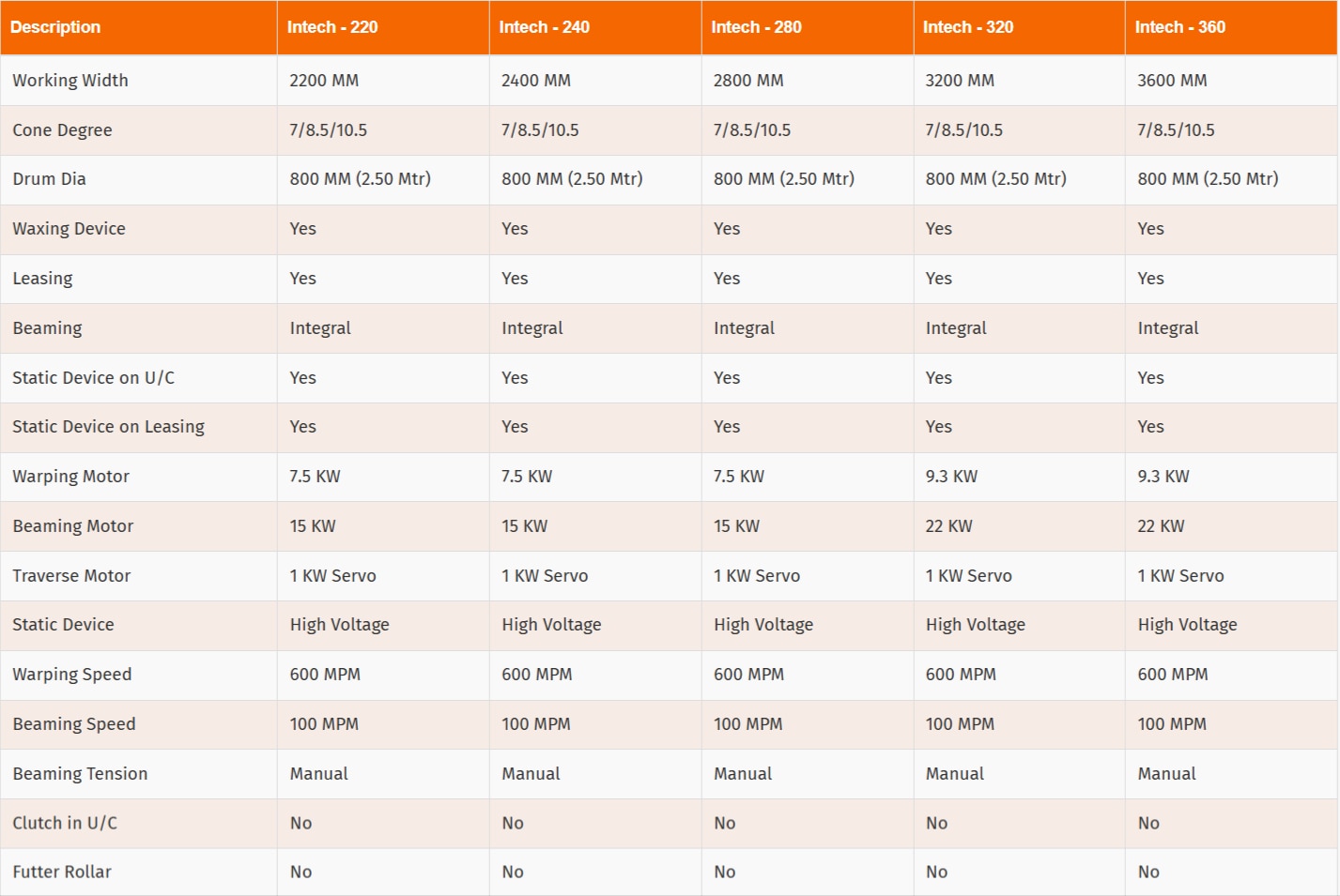 Clartech Engineers introduces the INTECH model – a high-performance Sectional Warping Machine engineered for precision, efficiency, and durability in textile warping applications. Available in working widths ranging from 2200 mm to 3600 mm, this machine is ideal for weaving preparatory processes across various scales of operations.